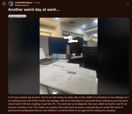 कर्मचारी ने अपनी पोस्ट के कैप्शन में समझाया, कि उसकी मैनेजर ने उसे पर्सनल फेवर के नाम पर कहा, कि उसके बेटे के पास कुछ स्कूल का काम है, जो बारहवीं स्टैंडर्ड का है और वह आईआईटी की तैयारी कर रहा है। काम था डायग्राम बनाने का। मैनेजर ने तो हद कर दी, जब उसने बाद में वापस बुलाकर यह भी चेक किया, कि वह कर्मचारी सही तरीके से डायग्राम बना रहा है या नहीं।