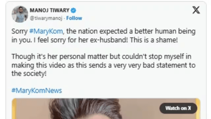 गुरुवार शाम को पूर्व क्रिकेटर मनोज तिवारी ने X (पूर्व में Twitter) पर एक पोस्ट में मैरी कॉम की आलोचना करते हुए लिखा, “Sorry #MaryKom, देश ने आपसे एक बेहतर इंसान होने की उम्मीद की थी। मुझे उनके पूर्व पति के लिए खेद महसूस हो रहा है! यह शर्मनाक है!” तिवारी ने अपनी पोस्ट में आगे लिखा, कि हालांकि यह उनका व्यक्तिगत मामला है, लेकिन वे खुद को रोक नहीं सके, क्योंकि इससे समाज को बहुत गलत संदेश जाता है। हालांकि तिवारी ने कुछ समय बाद यह पोस्ट डिलीट कर दी, लेकिन तब तक इसका स्क्रीनशॉर्ट सोशल मीडिया पर व्यापक रूप से शेयर हो चुका था।