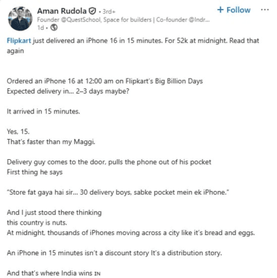 “Flipkart just delivered an iPhone 16 in 15 minutes. For 52k. At midnight. That’s faster than my Maggi.”